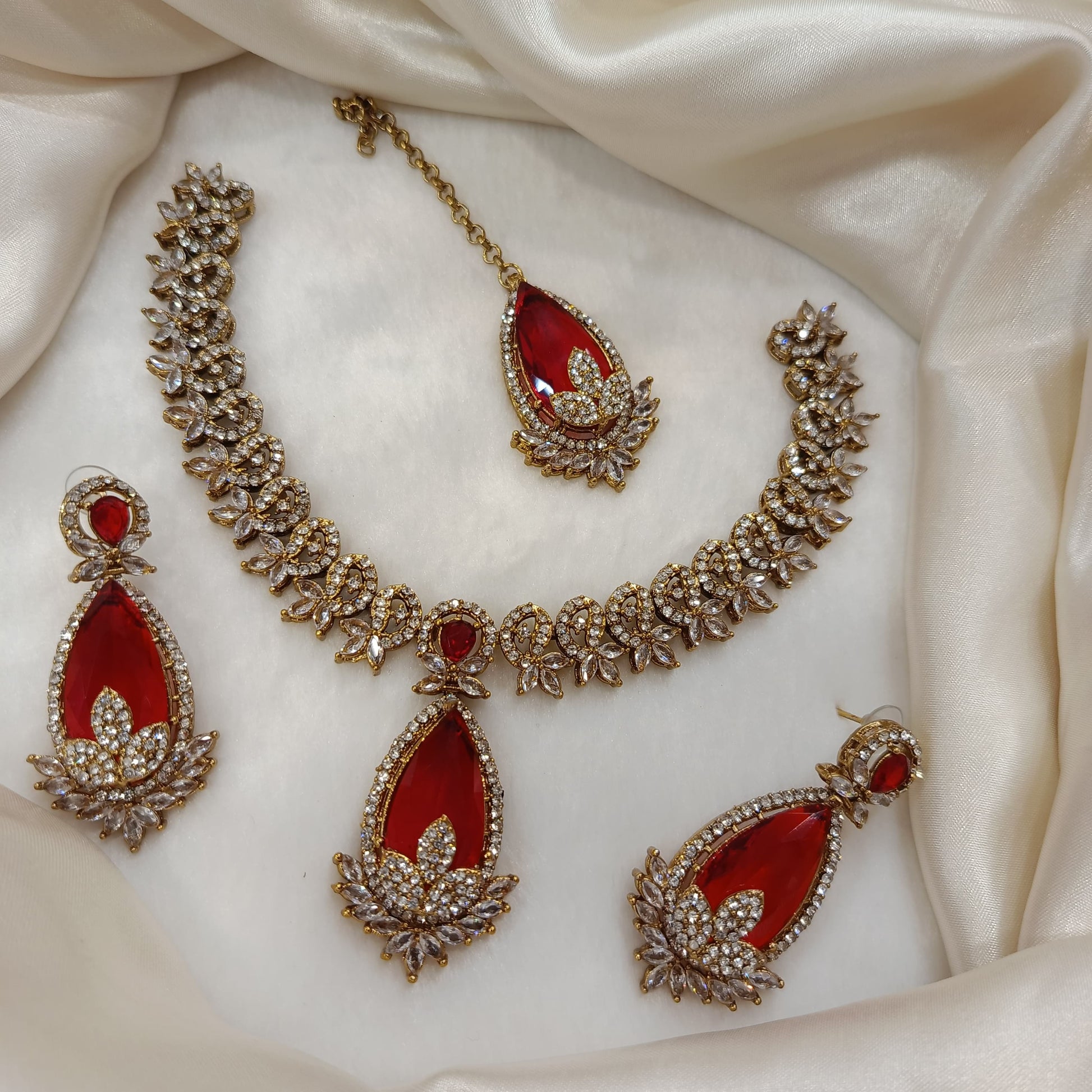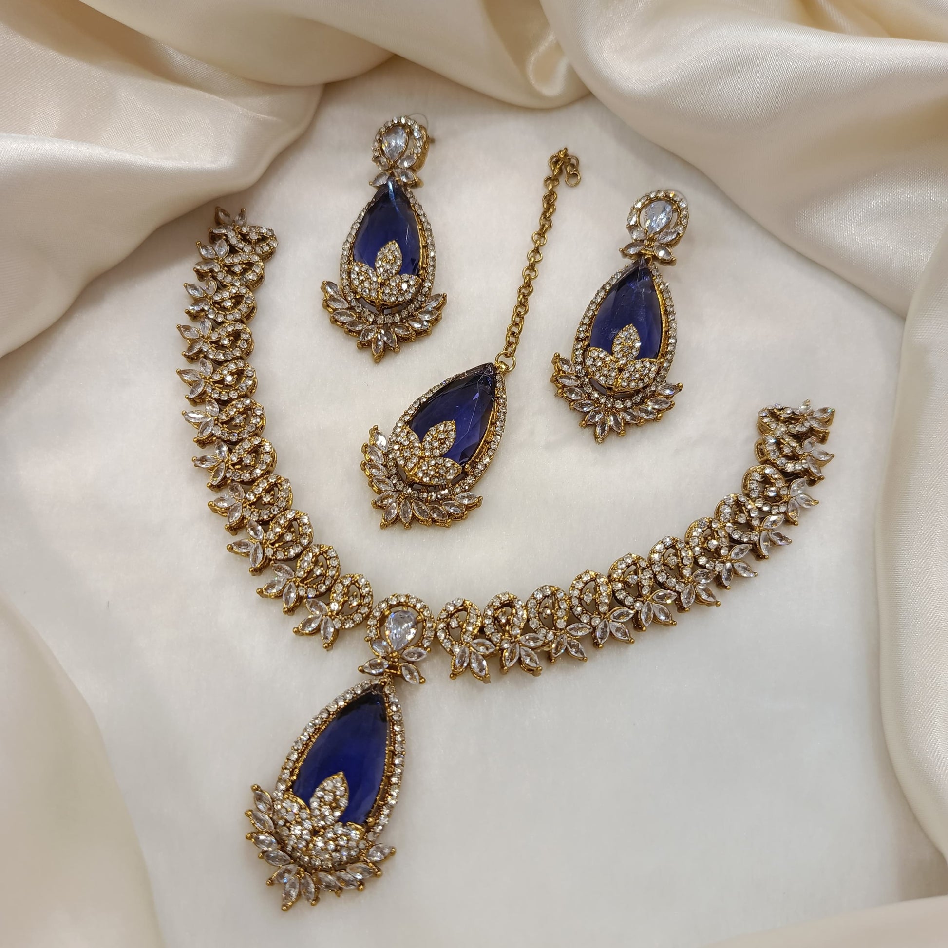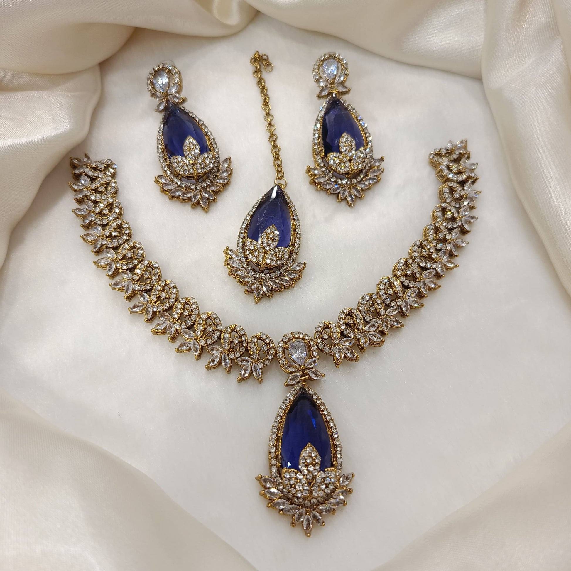 Step into timeless elegance with Bazm-e-Zewar, a regal ensemble crafted to celebrate tradition and beauty. This exquisite set features a necklace, matching earrings, and a maang tikka, each adorned with a radiant teardrop-shaped gemstone at the center. Surrounded by delicate floral and leaf motifs, the shimmering stones and intricate gold-toned detailing create a look of pure sophistication.