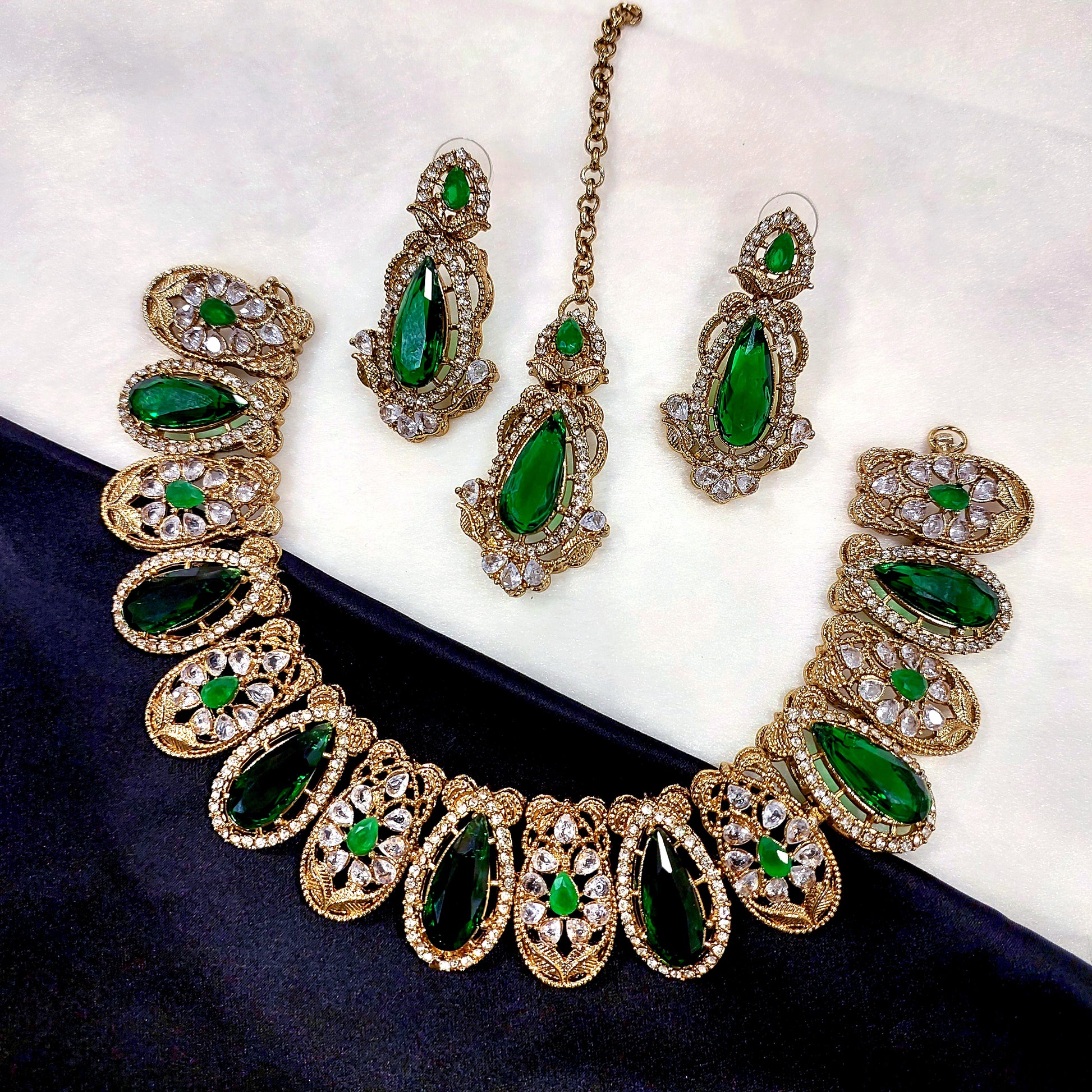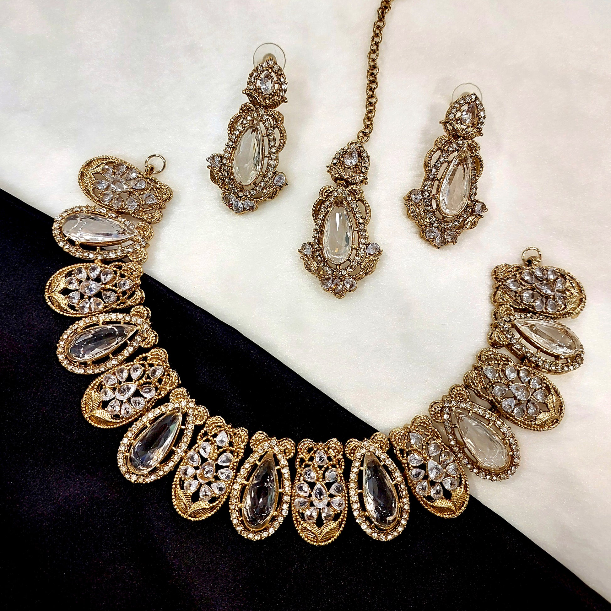 Elevate your presence with this timeless ensemble, a celebration of heritage and craftsmanship. Intricately designed with a harmonious blend of ornate detailing and premium stones, this set includes a statement necklace, matching earrings, and a maang tikka—each piece echoing the grandeur of traditional artistry. Perfect for weddings, festive occasions, or formal gatherings, its versatile charm complements both classic and contemporary attire. A true reflection of elegance, this set is crafted to leave a lasting impression.